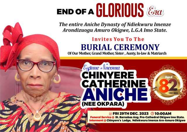 I personally appreciate the love and deepest empathy of esteemed stakeholders and leaders, captains of industry, Royal fathers, Religious and community leaders, heads of security agencies, organised Labour, unionists, civil servants, public officials, clubs and societies, student leaders and more especially all the beneficiaries of Nke Nke Enyi izuogu foundation for the needy and the aged. We will like to request friends, associates, and well wishers to join in giving our late Matriarch a glorious funeral for a glorious Exit. We covet your prayers and support as we prepare to send forth and celebrate the life of my dearest mother Mrs Catherine Chinyere Aniche.