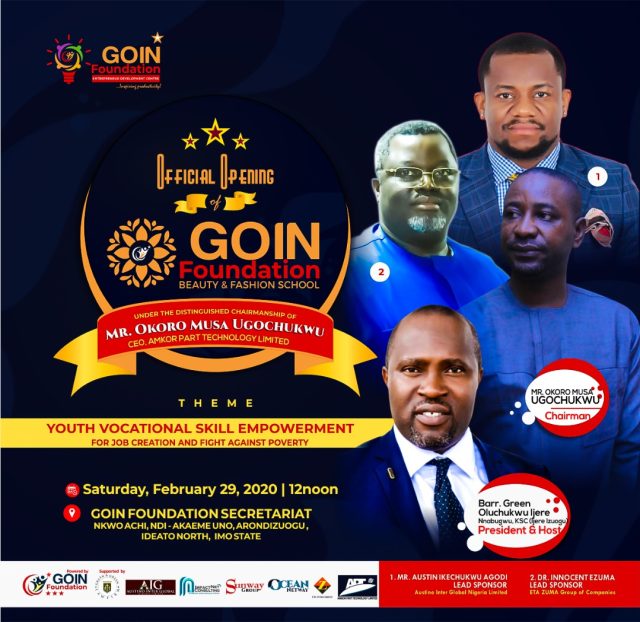 GOIN Foundation Enterpreneurship Development Centre is marking the Formal Opening of her SCHOOL OF BEAUTY and FASHION this weekend, Saturday, Feb 29 by 12 noon at Arondizuogu. With this, our Foundation will be empowering and transforming the lives of hundreds of youths and women with FREE VOCATIONAL TRAINING covering Fashion & Designing, Make Up Artistry, Hair making , etc