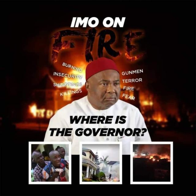 The conflagration of insecurity has continued to rage in Imo State. In the last twenty-four hours, unsavoury reports have kept emanating from all corners of the State. From the inferno in Okigwe to the bloodbath in Ehime; from the pyromancy in Ama Hausa to the armed robberies at Akwakuma and Ohii Junctions, one question that keeps agitating the minds of Imo people remains: Where is our supposed governor?