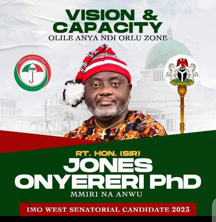 You will remember that it was on the 26th May, 2022, that Rt. Hon. Jones Onyereri defeated Rt. Hon. Jerry Alagboso in the PDP Senatorial Primary election for Imo West which took place at Aladinma Shopping Mall, Owerri, Imo state, where Dr. Jones Onyereri defeated Hon. Jerry and two others scoring 228 votes while Hon. Jerry scored 57 votes in a free, fair, credible and transparent contest.In a press release by DG Jones Onyereri Media Campaign Organization Mr. Uche Ezekwe and obtained by gisthub24.com, said thus”Today, the Federal High Court has reaffirmed the landslide victory of the good people Orlu Zone PDP Adhoc delegates as the Honourable Court Declares Dr. Jones Onyereri as the duly elected candidate for Imo West (Orlu Zone) Senatorial District election coming up in February, 2023.Congratulations to all of us as we come together to ensure victory for PDP in Orlu Zone come 2023.”