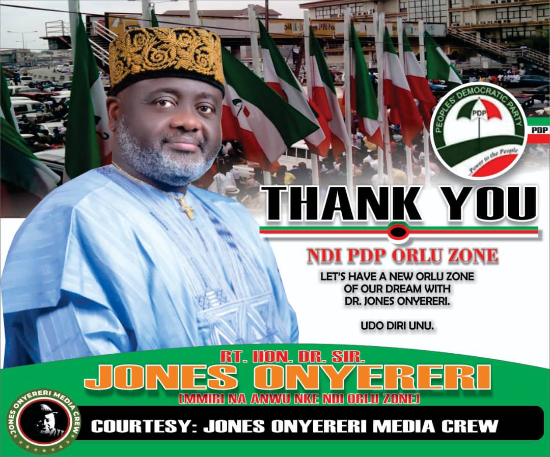 The OLILE ANYA NDI ORLU ZONE CAMPAIGN ORGANIZATION of Rt. Hon. Dr. Sir Jones Onyereri, the winner of 2022 Imo West Senatorial District of People’s Democratic Party Primary Election, congratulates and thanks in a special way the good people of Orlu Zone Delegates and the entirety of Imo West PDP for their unalloyed show of Love to Mmiri Na Anwu Nke Ndi Orlu Zone and the incoming Senator of Orlu Zone come 2023.